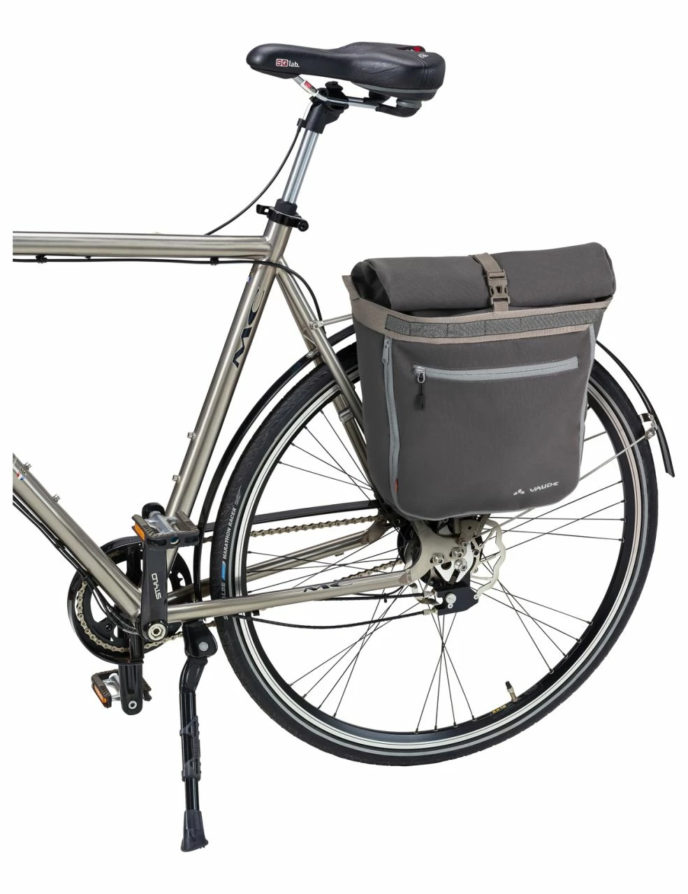 Faire ses courses à vélo ? Pas de soucis ! Grâce à cette sacoche à vélo, vous pourrez faire votre marché n’importe où. Le grand compartiment principal avec fermeture en papillote, offre suffisamment de place pour ranger les courses, les vêtements de sport et autres affaires pour vos loisirs. Grâce à la bandoulière fixe et à un zip supplémentaire qui permet d’agrandir le volume, cette sacoche est parfaite pour de longues journées de shopping. Dans la partie avant de la sacoche, une poche intérieure permet de ranger les objets de valeur. A la sangle réfléchissante vous pourrez attacher de petites choses grâce à un mousqueton. Une housse de pluie intégrée assure un transport bien au sec de vos courses même s’il pleut. Ce produit est imperméabilisé grâce à la finition Eco Finish, écologique et sans perfluorocarbures (PFC).