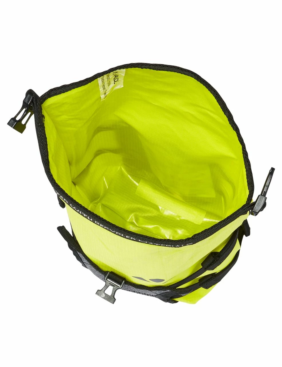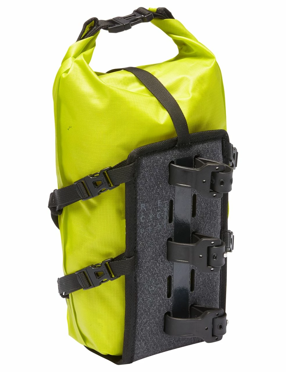 Trailmulti, c’est le nec plus ultra en matière de sacoche de vélo ! Non content d’offrir une large variété de possibilités de fixation, elle offre suffisamment d’espace pour ranger 6 litres ou 2 kilogrammes de bagages. Trailmulti est conçu pour une fixation sur des fourches présentant partout une circonférence d’au moins 9,5 cm. Le packsack imperméable avec fermeture à enroulement est inséré dans le support solide et souple à la fois avec fonction de compression et fixé à l’aide de trois sangles robustes. Une bande antidérapante sur la partie inférieure permet d’immobiliser Trailmulti pour qu’il reste bien en place. La sacoche de fourche maline n’est pas seulement un accessoire pratique pour le bikepacking. Elle apporte aussi une contribution non négligeable en matière de protection de l’environnement, car son support comme le packsack sont composés à 100 % de matériaux recyclés. Le label Green Shape de VAUDE garantit un produit écologique, fonctionnel et fabriqué dans des matériaux durables. En raison des fortes pressions exercées par les sangles sur la fourche pour la fixation, nous recommandons de ne pas utiliser ce produit sur des fourches en carbone. Compris dans la livraison : 1 pce